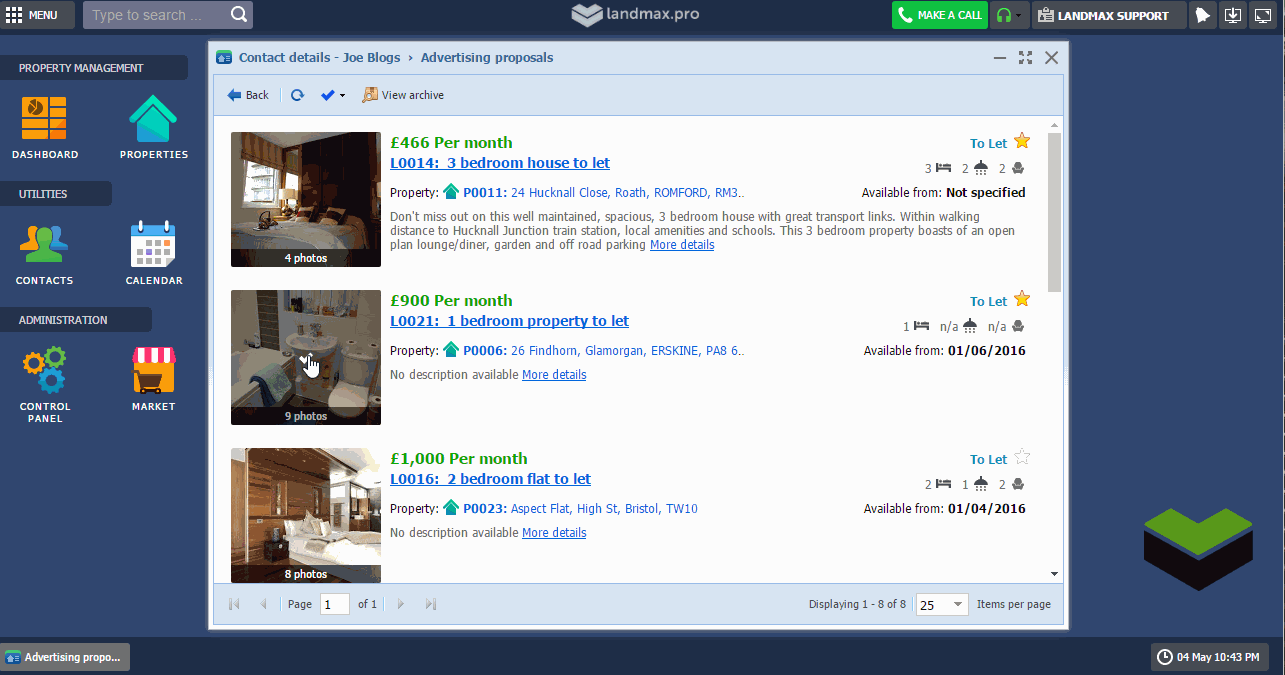 You can match any prospective tenant or purchaser against proposal and property information. This pull’s up a list of prospects who may be interested in this property based on matching parameters.